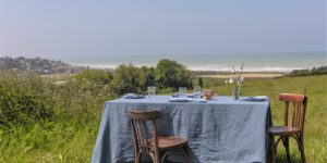 À l’occasion des Soirées Bleues organisées par le Plateau de Caux Tourisme, la grande table de banquet qui vous accueillera au cœur de la nature se pare d’un raffinement tout particulier grâce au partenariat avec la Maison Embrin.