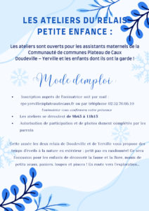 Les ateliers ne sont pas proposés pendant les vacances scolaires. Ces ateliers sont destinés à tous les assistants maternels du territoire communautaire Yervillais accompagnés des enfants qu’ils accueillent à leur domicile afin de partager un temps d’activité ludique et d’accéder à une première approche de la vie en collectivité.