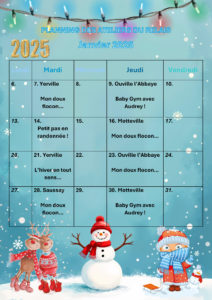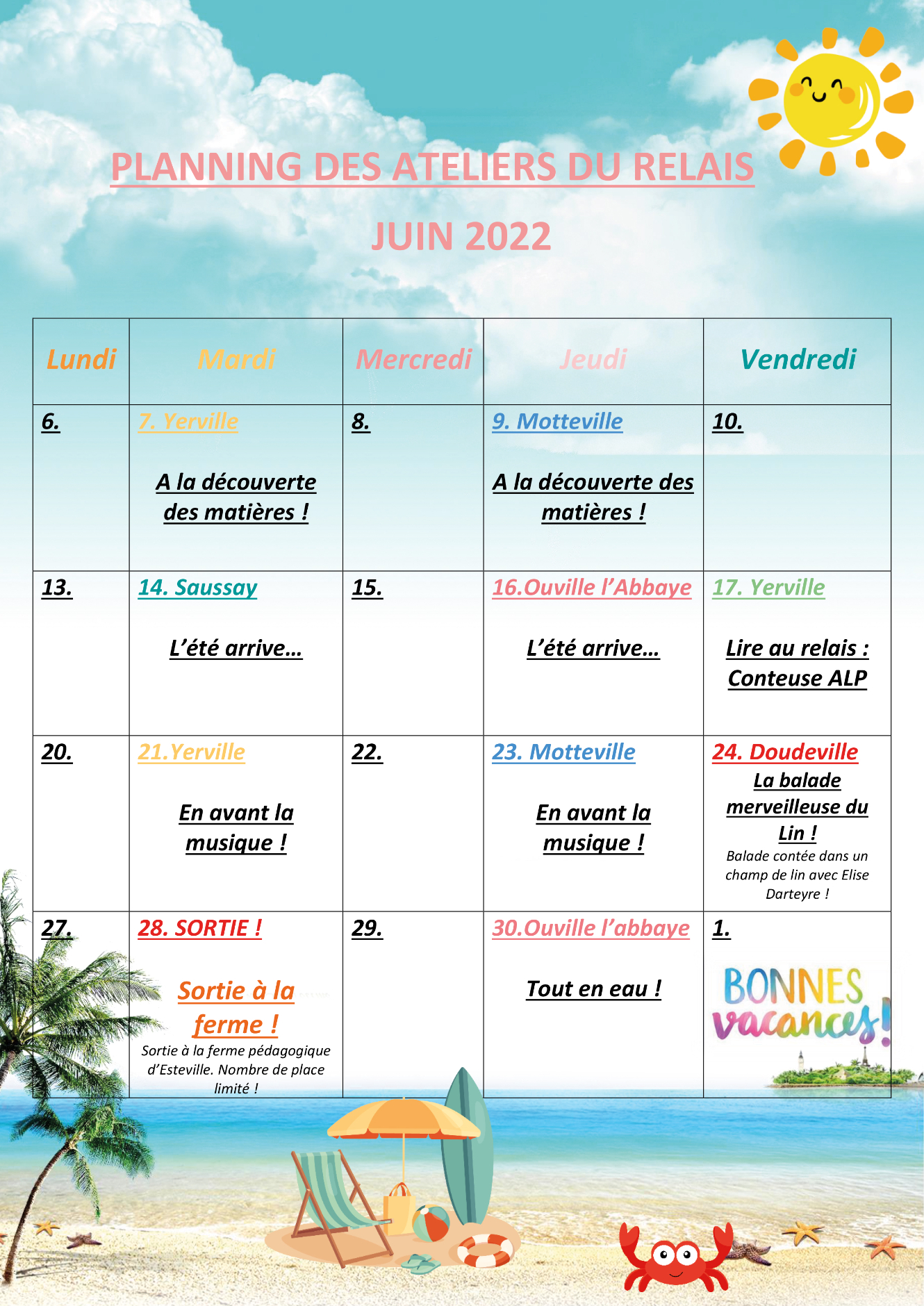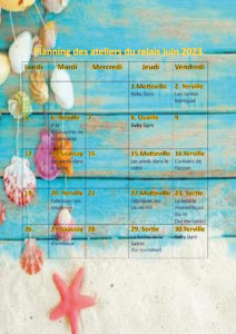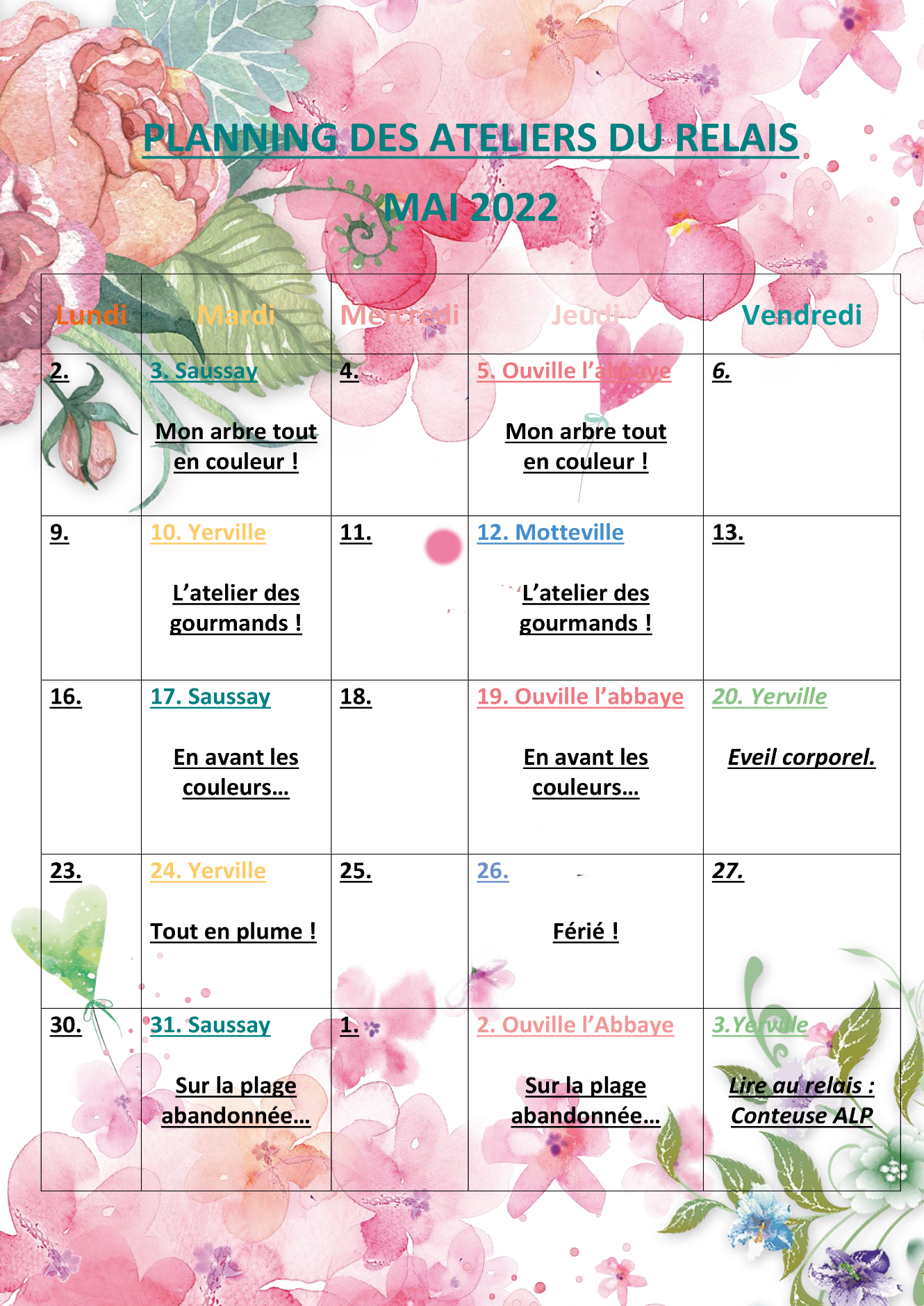 Les ateliers se déroulent les mardis et jeudi ainsi qu’un vendredi sur deux en semaine paire. Des ateliers d’éveils animés par une éducatrice de jeunes enfants sont proposés en itinérance sur les communes de Yerville, Ouville L’Abbaye, Motteville et le Saussay.